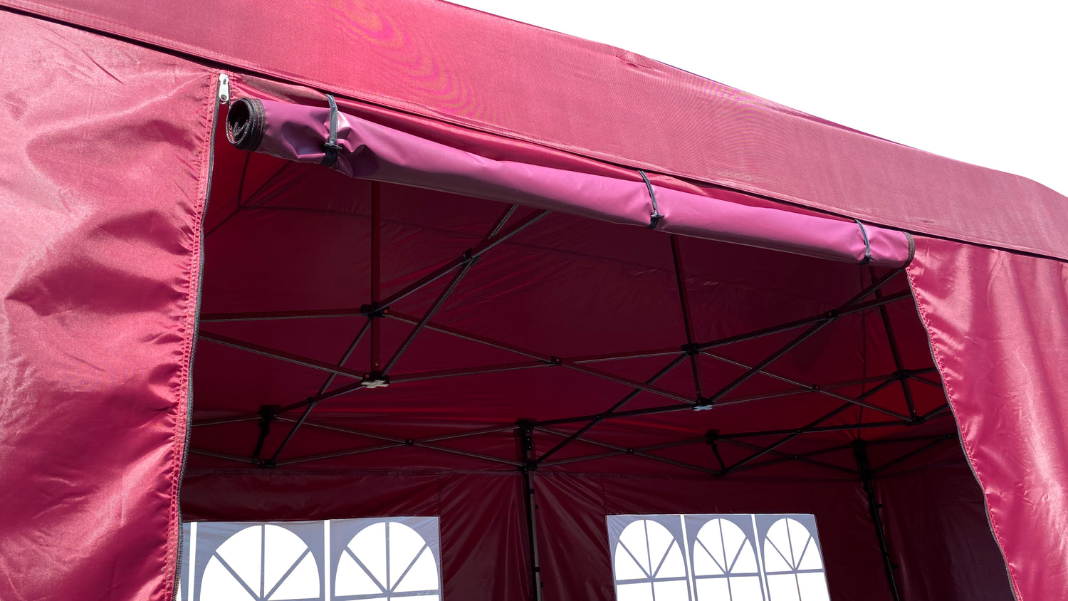 Das Dach und die Seitenteile aus Polyester 225g/m² sind strapazierfähig, UV beschichtet und wasserabweisend.