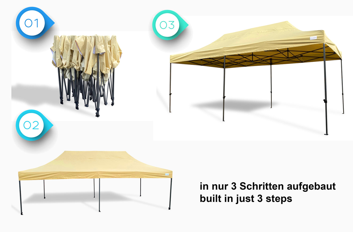 - Material: Gestell: Stahl doppeltpulverbeschichtet / Dach: Polyester, 225g/m².